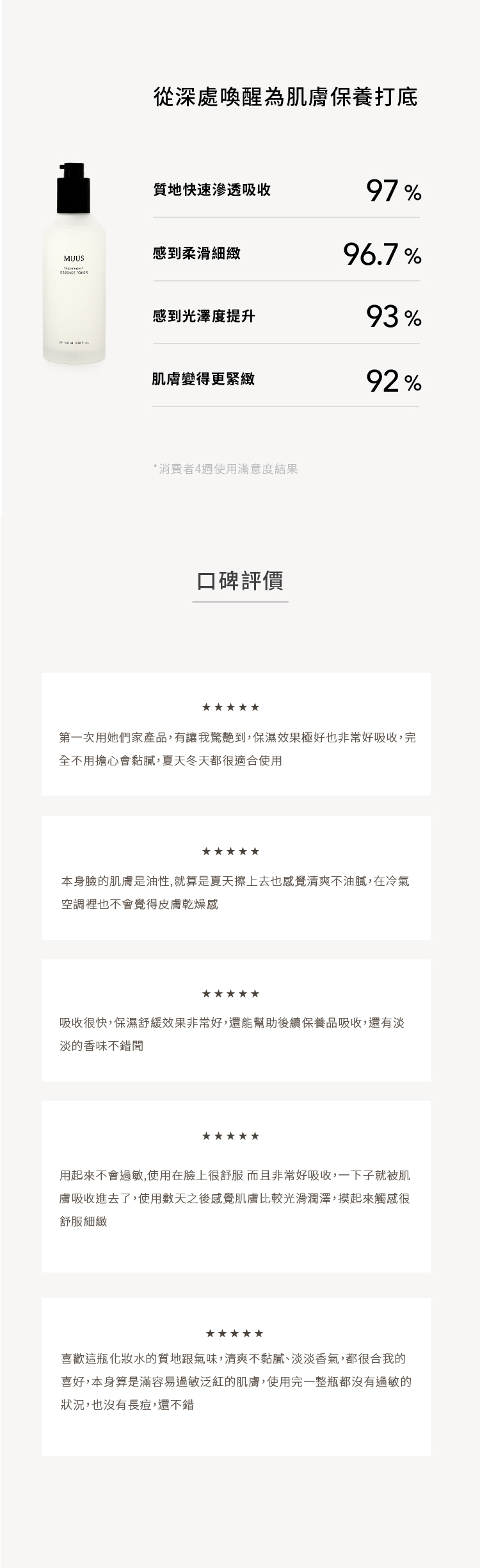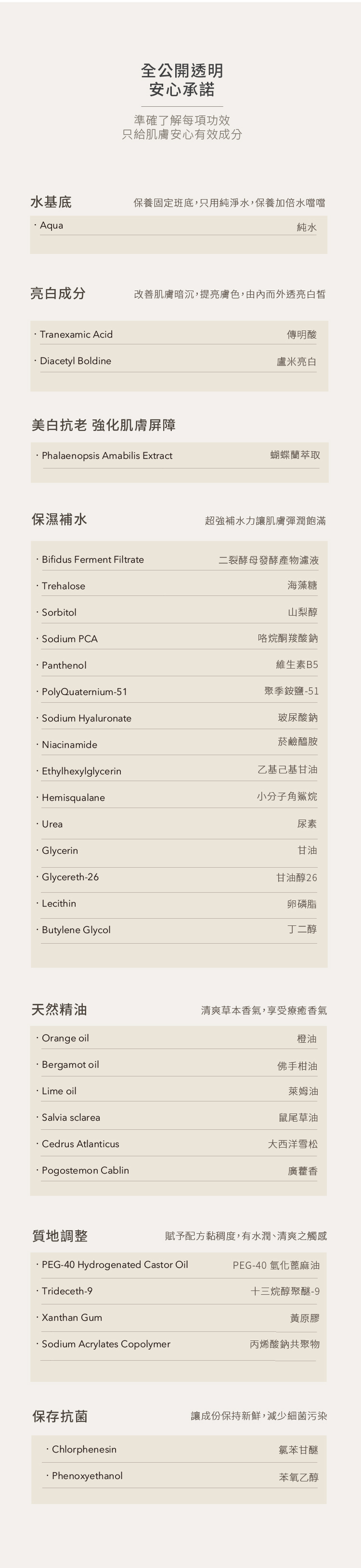 主要成分: 二裂酵母發酵產物濾液、Lumiskin™️ 盧米亮白專利成份、Lipidure-PMB 鎖水因子、蝴蝶蘭抗老因子、菸鹼醯胺、B5、小分子角鯊烷、玻尿酸鈉