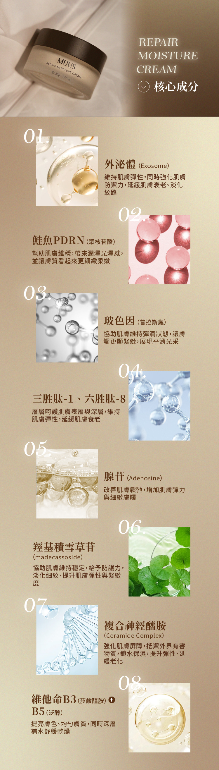 鮭魚PDRN與外泌體高修護 × 玻色因+雙胜肽+腺苷緊緻 × 神經醯胺潤澤屏障