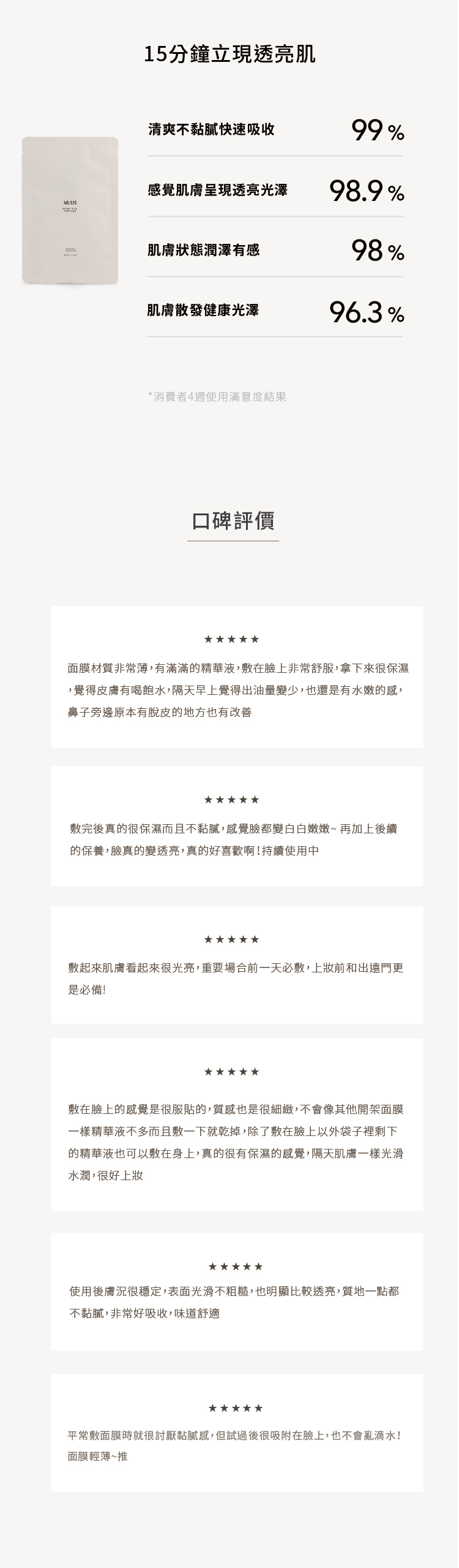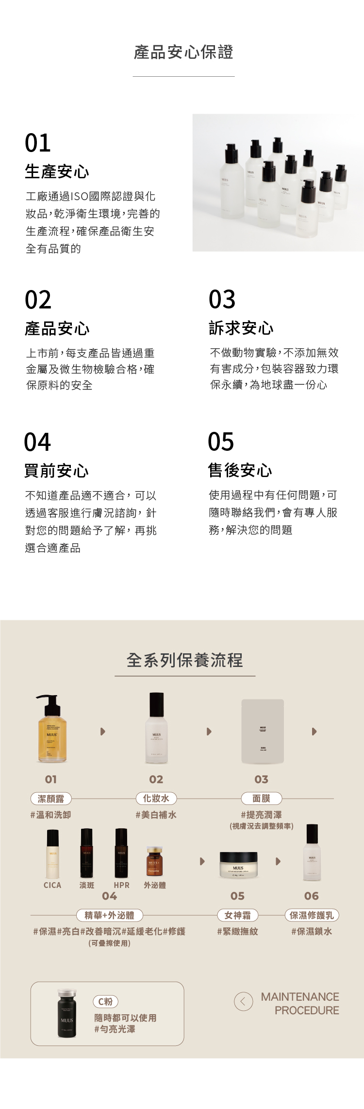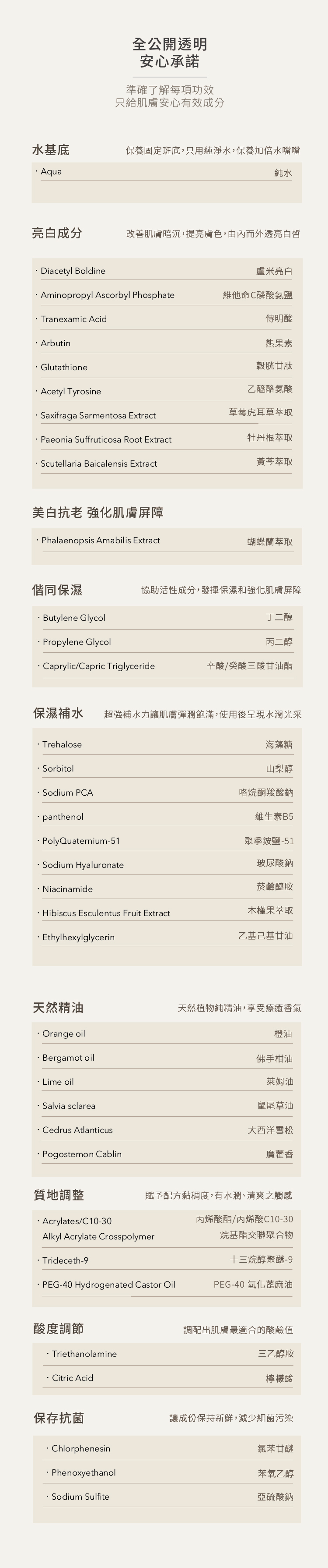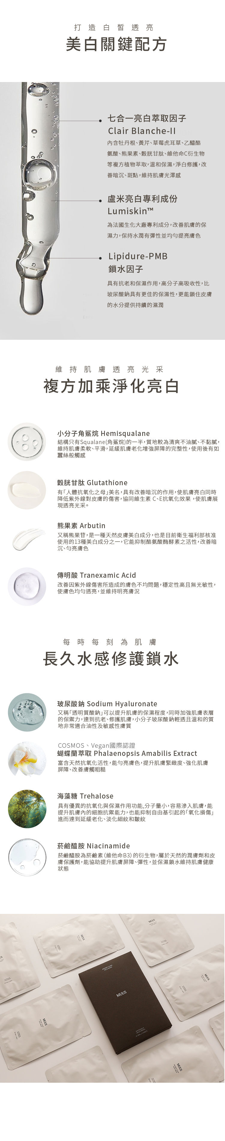 主要成分: Lumiskin™️ 盧米亮白專利、Clair Blanche-II七合一亮白因子、Lipidure-PMB 鎖水因子、木槿果萃取、海藻糖、小分子角鯊烷、蝴蝶蘭萃取、穀胱甘肽、菸鹼醯胺、B5、玻尿酸鈉