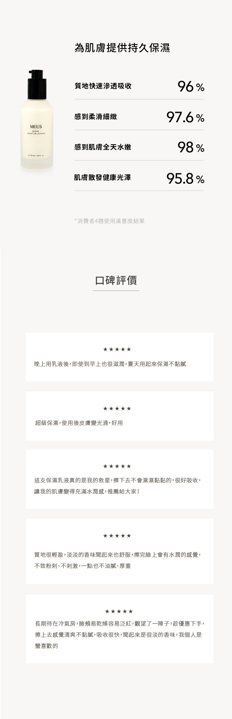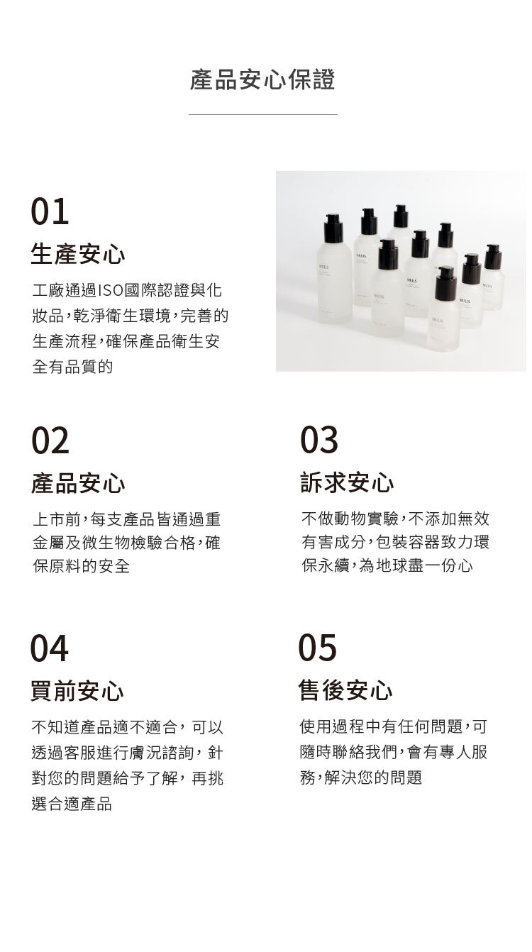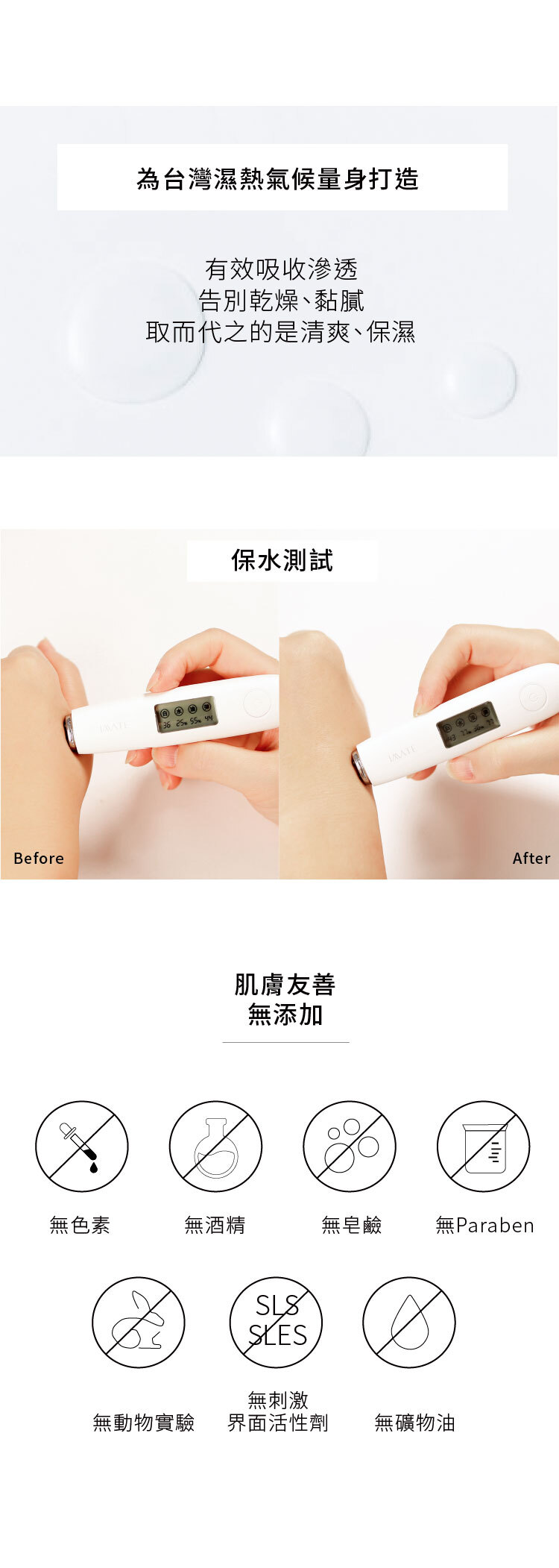 .小分子角鯊烷、白芒花籽油、荷荷芭油、楔基海帶萃取,對內鎖住水份,舒緩乾燥緊繃