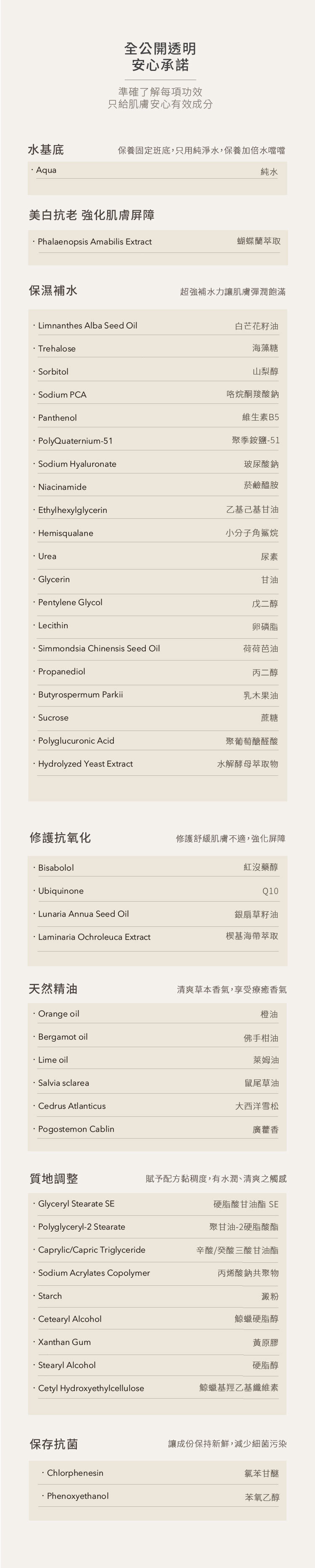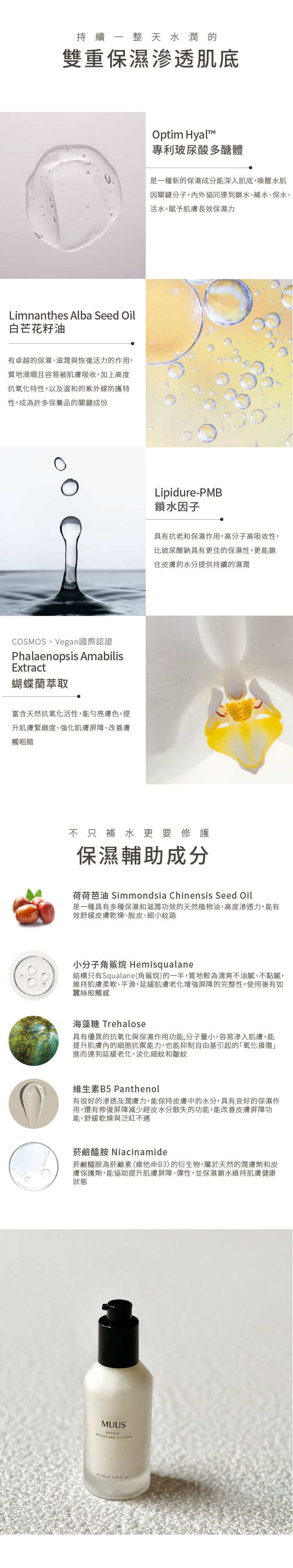 主要成分: Optim Hyal™ 玻尿酸多醣體抗老活性因子、Lipidure-PMB 鎖水因子、蝴蝶蘭修護因子、白芒花籽油、海藻糖、小分子角鯊烷、菸鹼醯胺、B5、玻尿酸鈉